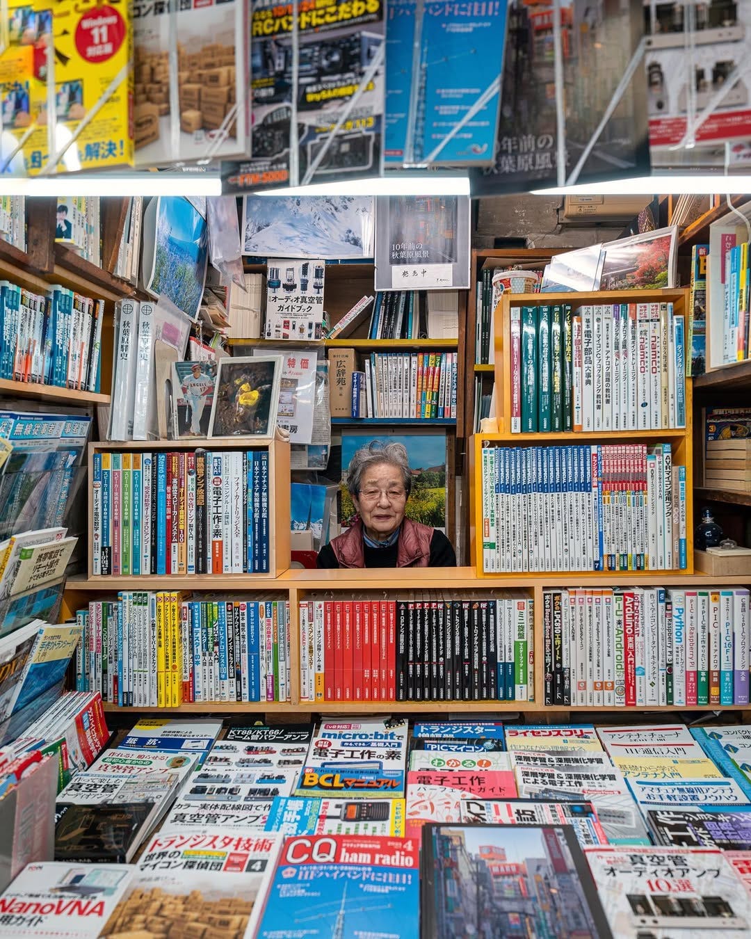 Some traces of the old Akihabara remain. Beneath the train tracks, small electronics and book shops continue to survive. Inside the aging Akihabara Radio Center, 89-year-old Kazuko Shimotori runs Mansei Shobo, a shop specializing in radio and engineering books. “My father opened this store over 70 years ago,” she said. “But customers got older, and books stopped selling. Everyone buys online now.” Surrounded by new buildings, she plans to close by year’s end. “I will be 90 soon. It’s sad, but it cannot be helped.”