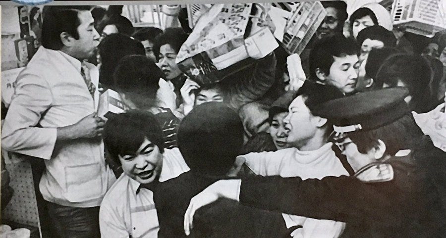 Tissue paper riots during the 1973 oil shock at the Aoyama Peacock supermarket in Tokyo.